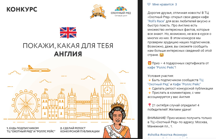 Кстати, сегодня в честь открытия кафе с группе «Охотный ряд» в VK запустили конкурс «Покажи, какая для тебя Англия». 21 октября организаторы конкурса объявят четырех победителей.