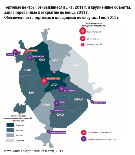 До конца года заявлен ввод более 1 млн площадей (GLA – 580 тыс. м2). Однако открытие ряда проектов может быть перенесено, поэтому фактический прирост предложения во II-IV кварталах 2011 г., по нашим прогнозам, составит около 650 тыс. м2, GLA – 280 тыс. м2, по итогам 2011 г. новое предложение торговых центров составит 880 тыс. м2, GLA – около 400 тыс. м2.