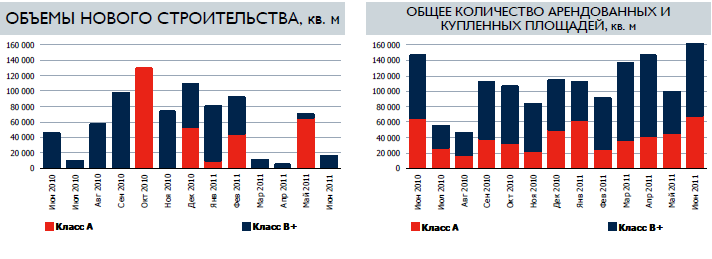 Объем купленных и арендованных офисных площадей класса А и Б+ по итогам июня составил около 240 000 кв. м. Такой объем сделок является одним из рекордных и сопоставим только с началом 2008 года. В июне 2011 было закрыто 12 крупных (более 2 000 кв. м) сделок, общей площадью более 100 000 кв м.