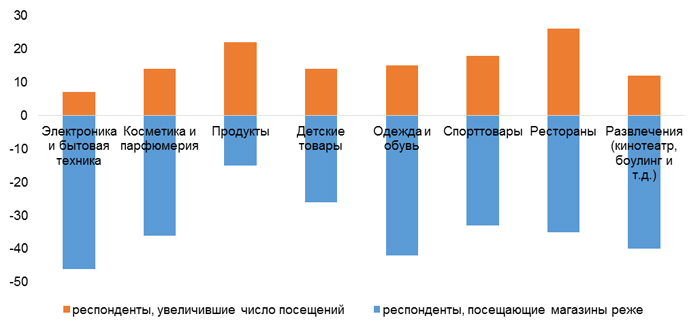 Относительно частоты посещений магазинов по профилю, в «зеленой зоне» оказались места общественного питания и супермаркеты, в «красной», где частота посещений сократилась – бытовая техника и электроника, косметика, одежда и обувь, развлечения.