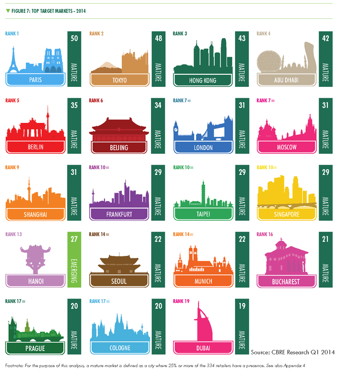 «Улучшающаяся экономическая ситуация в Западной Европе и Северной Америке подталкивает глобальных игроков ритейла переориентировать свои планы по расширению бизнеса на зрелые рынки и на ведущие центры мировой розничной торговли, среди которых главенствуют Париж, Токио, Лондон и Берлин. Ритейлеры обратили также внимание на восстанавливающиеся европейские рынки и на азиатские и южноамериканские города, где их присутствие пока явно недостаточно.