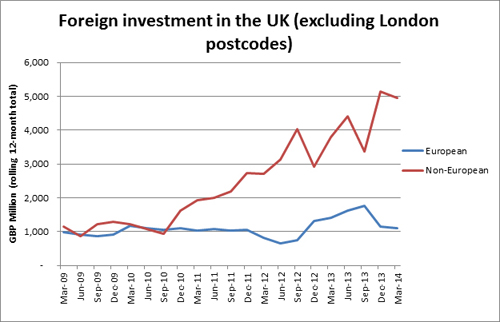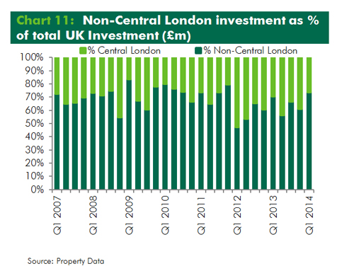 Сумма сделок, совершенных иностранными инвесторами за пределами Центрального Лондона, составила около 1,2 млрд. евро (1 млрд. фунтов стерлингов), включая девять сделок, совершенных инвесторами из Азии и с Ближнего Востока.Инвесторы, находящиеся за пределами Европы, постоянно увеличивают размер своих инвестиций в региональные города Великобритании, начиная с падения рынка во II квартале 2009 года, в результате чего в I квартале 2014 года принадлежащая им доля рынка выросла с 7% до 18%.