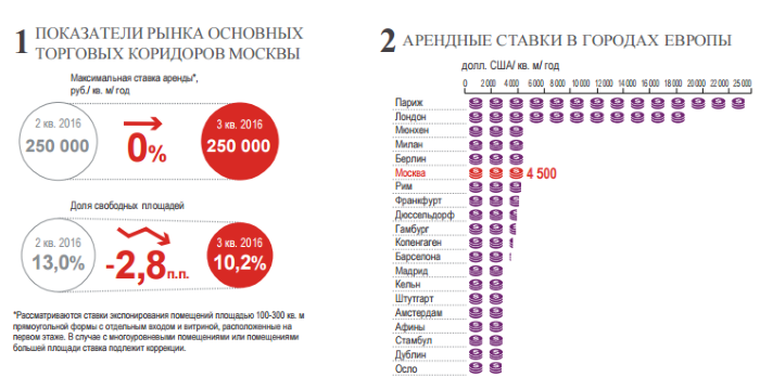В 3 кв. 2016 года максимальная ставка аренды на основных торговых улицах Москвы осталась неизменной, составив 250 тыс. руб./ кв. м/ год.