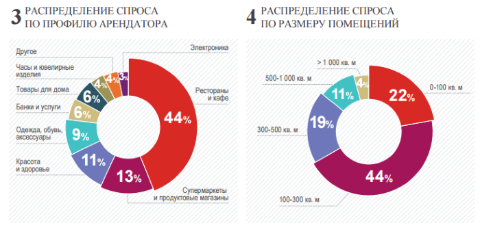 Доля свободных помещений на основных торговых улицах снизилась с 13% до 10,2%. Самыми заполненными торговыми коридорами в этом квартале стали Мясницкая улица и район Патриарших прудов, где доли свободных помещений составили 5,6% и 6,8%, соответственно. Стоит отметить заметное снижение доли вакантных площадей на Новом Арбате (с 16% до 8,5%) и небольшой рост ставок аренды на этой магистрали вследствие проведенной реконструкции. Наиболее активный спрос на помещения стрит-ритейла продолжают проявлять представители сегмента «рестораны и кафе» (44% от общего количества запросов). Продуктовые магазины сформировали 13% общего заявленного спроса, а представители сегмента «красота и здоровье» - 11%. Был отмечен рост спроса на помещения площадью от 100 до 300 кв. м (44% от общего объема запросов).