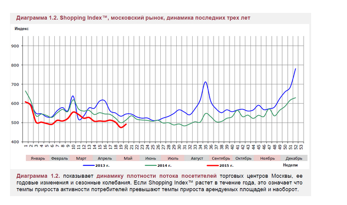 Что касается юга Москвы в целом по посещаемости ТРЦ, (Астрахань, Волгоград, Новороссийск, Краснодар и т д), посещаемость ТРЦ, начиная с 6 мая там была выше средней посещаемости за 2014 год и выше, чем в Москве в этот период.