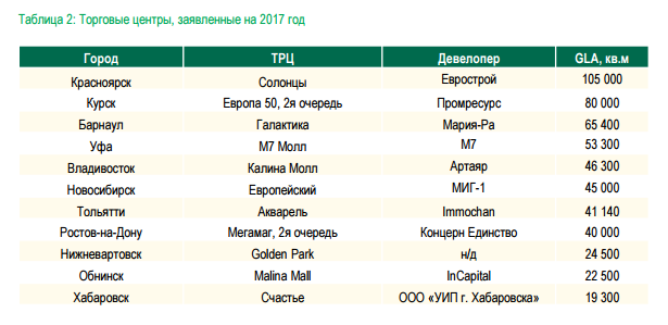 • Крупнейшим торговым центром 2017 года станет ТРЦ «Солонцы» в Красноярске (105 000 кв. м GLA).