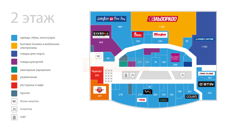 Якорные операторы ТРЦ: продовольственный гипермаркет «Макси», супермаркеты бытовой техники и электроники «Эльдорадо», спортивных товаров «Спортмастер», магазин косметики и парфюмерии «Л`Этуаль», магазины модной одежды Befree, а также одежды для всей семьи O`Stin, Gloria Jeans, «ТВОЕ». Также в ТРЦ представлены магазины Rieker, Kari, Steilman, Chester, Gulliver, «Линии любви», 585, «МЮЗ», Sunlight, Kira Plastinina, Paolo Conte, «Аскона» и семейно-развлекательный центр «Дейфи».