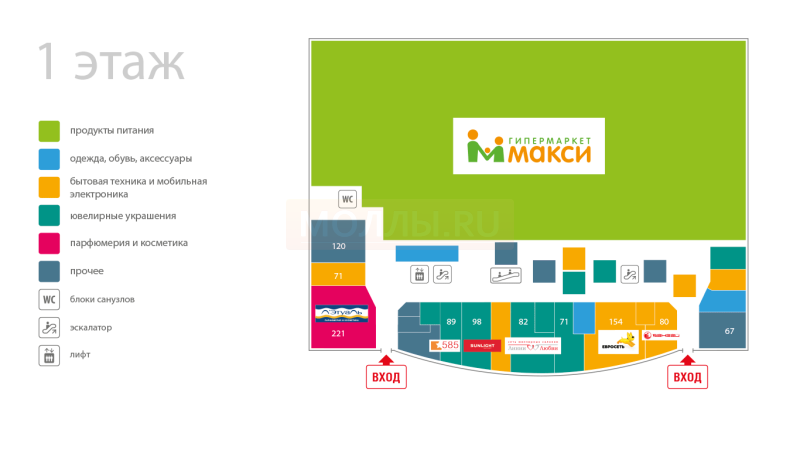 Всего в составе торговой галереи ТРЦ «Макси» более 70 магазинов, а также предприятий общественного питания, развлечений и сферы услуг.