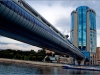 Торгово-пешеходный мост состоит из двух уровней. Нижний уровень представляет собой застеклённую на всём протяжении крытую галерею. Для удобства пешеходного движения на данном уровне установлены горизонтальные травалаторы. Верхний уровень застеклён частично, на нём находится открытая смотровая площадка. На мосту расположены торговые павильоны. Со стороны Краснопресненской набережной вестибюль моста соединен с выходом станции метро «Деловой центр». На этой стороне на набережной находится одноимённый теплоходный причал. Со стороны набережной Тараса Шевченко мост совмещён с «Башней 2000», далее проходит аллея до Кутузовского проспекта, на которой сооружён памятник П. И. Багратиону.