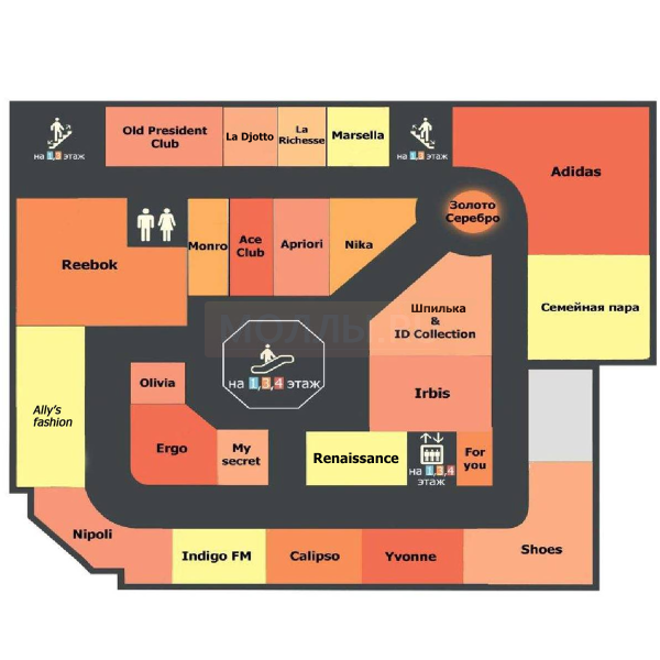 Одежда: MODIS, Gloria Jeans, O’stin, Indigo FM, Ace club, Monro, Marsella, Old President Club, Джентельмен, Элегант.