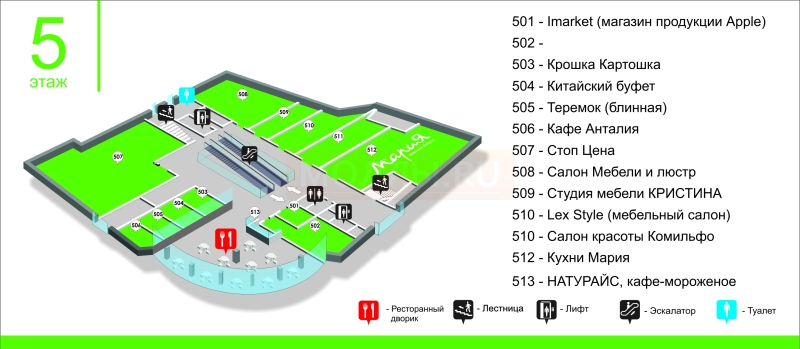 5 этаж - Фудкорт «Gastromarket» (грузинская кухня «Джанико», вьетнамская кухня «Ban Bo», итальянская кухня «Rigatoni», бар), салон красоты «Комильфо», барбершоп «Бородач», «Кухонная студия Мария», магазин женской одежды «АЖУР», постаматы по выдаче интернет-заказов;