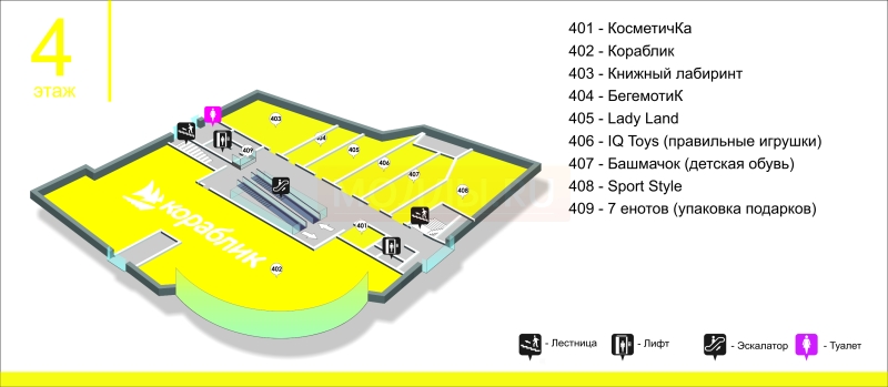 4 этаж – подарочная упаковка, сувениры, детские мини-аттракционы, детский супермаркет «КОРАБЛИК», магазин книг и канцтоваров «КНИЖНЫЙ ЛАБИРИНТ», магазины женской одежды «BELLA», «Распродажа круглый год», магазин спортивной одежды «Sport Style», магазин детской обуви «Башмачок»;