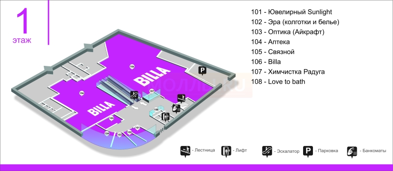 1 этаж – супермаркет «Супер-Лента», салон «МТС», кухонные аксессуары «FISZMAN», аптека «Ригла», островок восточных сладостей, магазин электроники «Позитроника», магазин «Портсигар», банкоматы (Альфа банк, Промсвязьбанк, Тинькофф, ВТБ), услуги (ремонт телефонов, химчистка), пункт приема платежей;