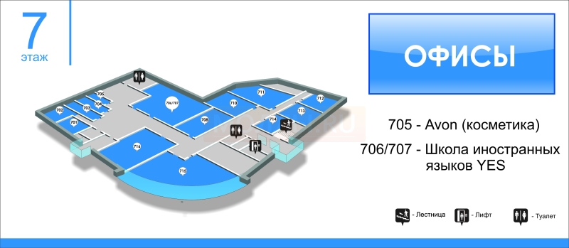 7 этаж – школа иностранных языков «Школа английского языка Yes», автошкола «Автошкола имени Давыдова», офисные помещения