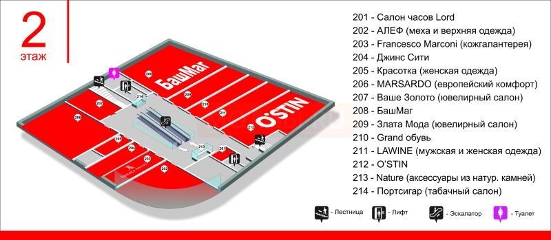 2 этаж – бутик украшений «La Nature», Кофе-станция PUSHKINO, магазины женской и мужской одежды и аксессуаров «O`STIN», «Street Drive», «Джинс Сити», «Эстет», «LAWINE», магазины обуви «БашМаг», «GranD ОБУВЬ», сеть магазинов косметики «Подружка», ювелирные салоны «SUNLIGHT», «SOKOLOV jewelry», «Ваше золото», магазин кожгалантерейных товаров «Francesco Marconi», мелкий ремонт (ювелирный, часы, изготовление ключей);