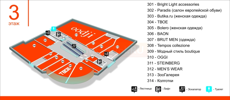 3 этаж – пункт выдачи интернет-заказов «WILDBERRIES», магазины женской и мужской одежды и аксессуаров «OGGI», «ТВОЕ», «STEINBERG», «MEN`S WEAR», «BOLERO», «CITY CLASSIC», «VAN & CLIFF», «Модный стиль boutique», «TUNEL CLUB», галантерея, бижутерия, аксессуары «Bright Lite»;