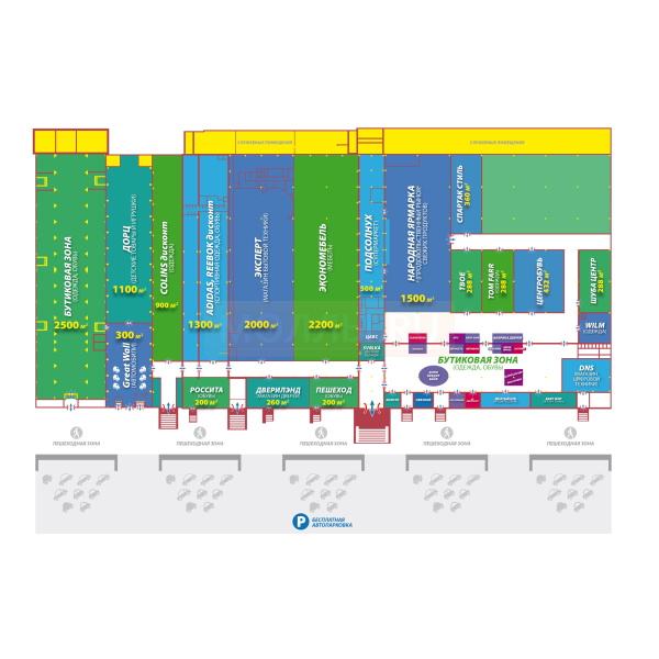 Якорные арендаторы: Продуктовый рынок «Народная Ярмарка», гипермаркет бытовой техники и электроники «Эксперт», «ЭконоМебель», «Двери-лэнд», Adidas-дисконт, Reebok-дисконт, Colins-дисконт, Тom Farr дисконт, «Шуба Центр», магазин детских товаров «ДОРЦ», обувные залы «Россита», ЦентрОбувь, Пешеход, автосалон «Great Wall», супермаркет цифровой техники «ДНС», салон сотовой связи «Евросеть», «МТС», «Мегафон», «Связной», «Ростелеком», магазин подарков «Желтый куб», Tescoma, 5-Д кинотеатр.