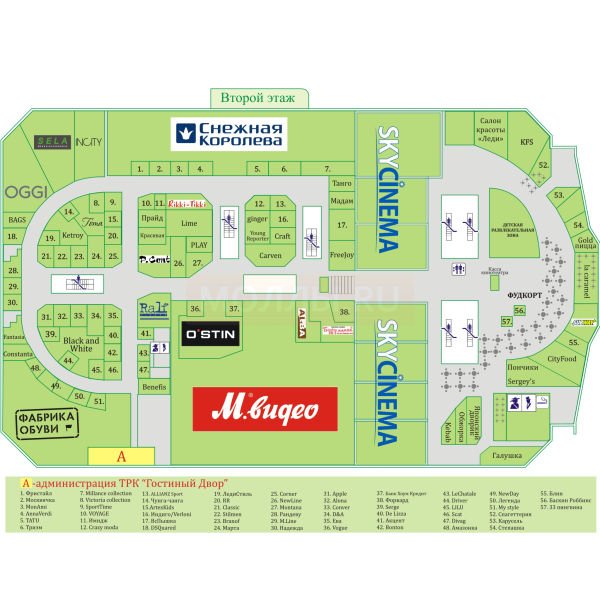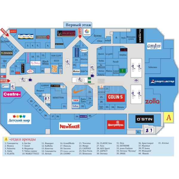 Арендаторы (представленные марки): CorsoComo, Carlo Pazolini, ALBA, Эконика, Paolo Conte, Zenden, Пан Чемодан, Palmetta, Calzedonia, Incanto, Motor, Дефиле, Sela, Nike, Гулливер,Young Reporter, Ginger, Lime, Связной, Евросеть, МТС, Kira Plastinina, Carven, Climber, Henderson, Каменный цветок, Sunlight, Московский Ювелирный завод, Incity, Oodji (OGGI), Фабрика обуви, Play, Ralf Ringer, Буду Мамой, Буква, Позитроника, Atlantik, Respect, Твое, Camel Active, Jolie, Style, Империя Сумок, Lady Collection, Strawberry, Экспедиция, Tescoma.