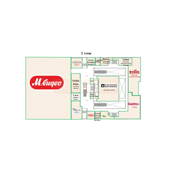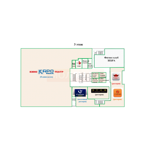 Якорные арендаторы: супермаркет «Перекресток», кинотеатр «Каро фильм» (8 кинозалов), магазин электроники «Мвидео», фитнес клуб «Зебра».