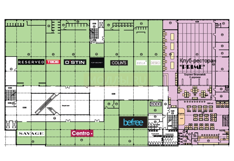 В северной части здания располагается ресторан-клуб на 260 посадочных мест площадью 1600 кв.м., с боулингом Brunswick на восемь дорожек и бильярдом.