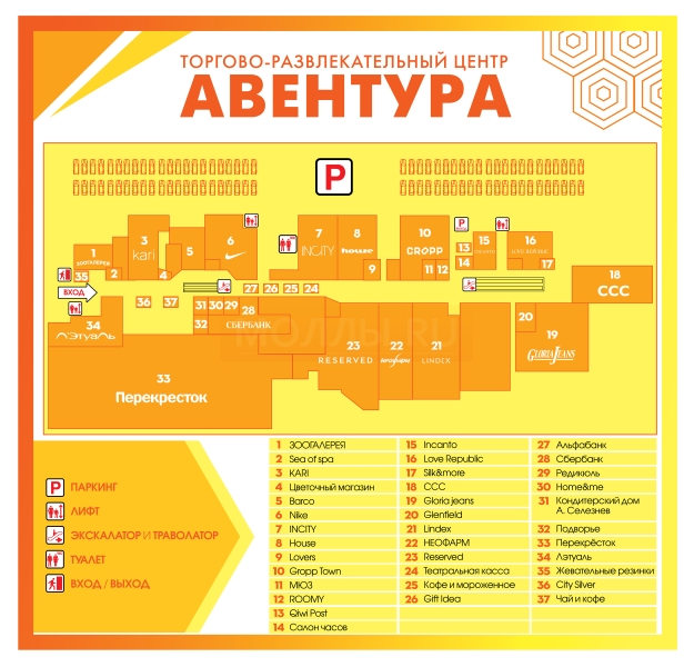 Сопутствующие арендаторы: Gloria Jeans, Reserved, Cropp Town, Nike, Incity, Красный Куб, Befree, Love Republic, Centro, Сити Обувь.