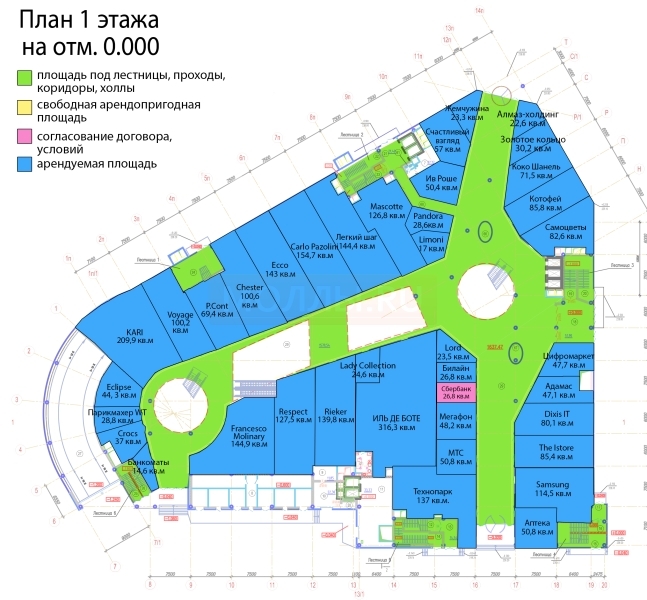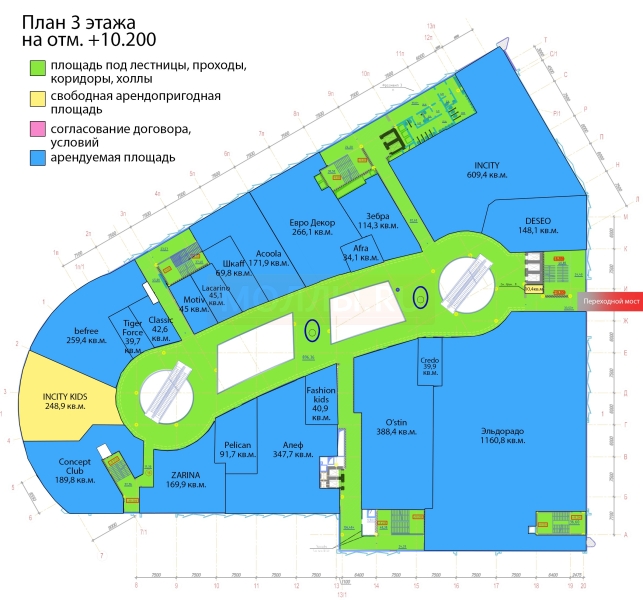 Якорные арендаторы: Love Republic, Bershka, Mohito, Stradivarius, Henderson, Kanzler, Be Free, House, Zarina, Deseo, Incity, Снежная королева, Modis, SubWay, McDonalds, Жар-Пицца, Суши Бар, Крошка-Картошка, Блинкоff, Carlo Pazolini, Эконика, Lord, Иль Де Боте. Гипермаркет Европа, Медиа Маркт.