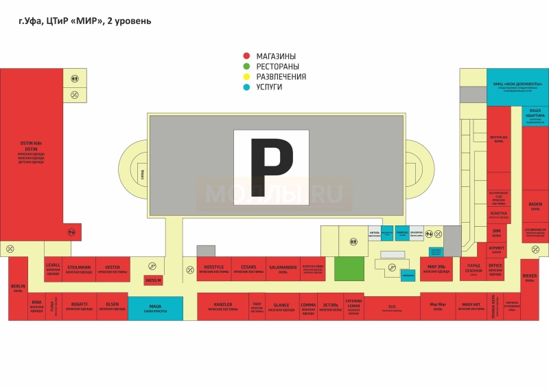 Торговая галерея: Спортмастер, М.Видео, Samsung, Рив Гош, ЛЭтуаль, O'Stin,Caterina Leman, Эстель Адони, Bugatti, Scotch&Soda, Lee\Wrangler, DIM,Steilmann, Kanzler, Salamander, Westfalika и многие другoe.
