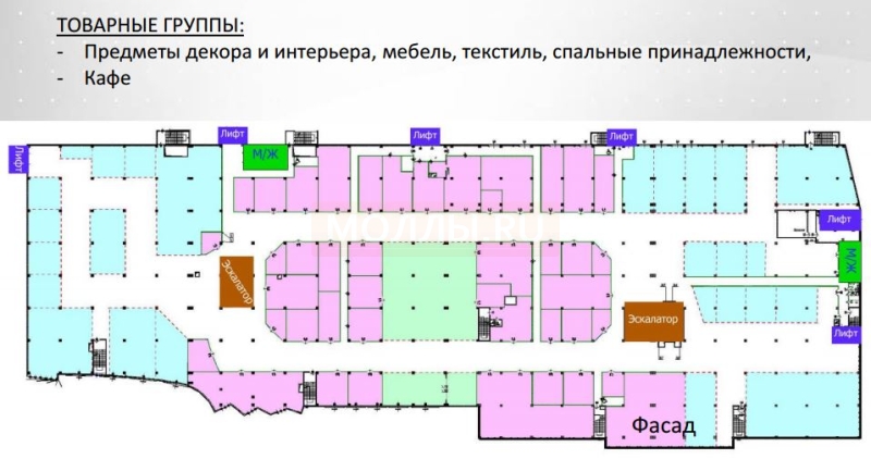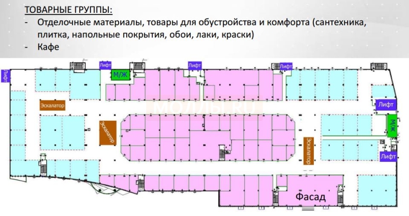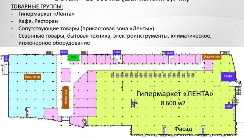 1 этаж: Гипермаркет “Лента”, сопутствующие и сезонные товары, бытовая техника и электроника, климатическое, инженерное оборудование