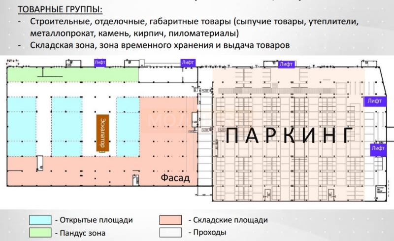 0 этаж: Строительные, отделочные, товары (кирпич, блоки, сыпучие товары, дерево, утеплители, металлопрокат, камень и др.), Склады, зона временного хранения и выдачи товаров