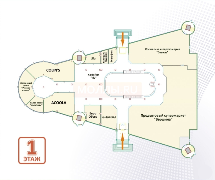 Торговая галерея представлена крупными якорными арендаторами и магазинами известных брендов. Развлекательную составляющую представляет развлекательный центр для детей и взрослых «Джунгли».