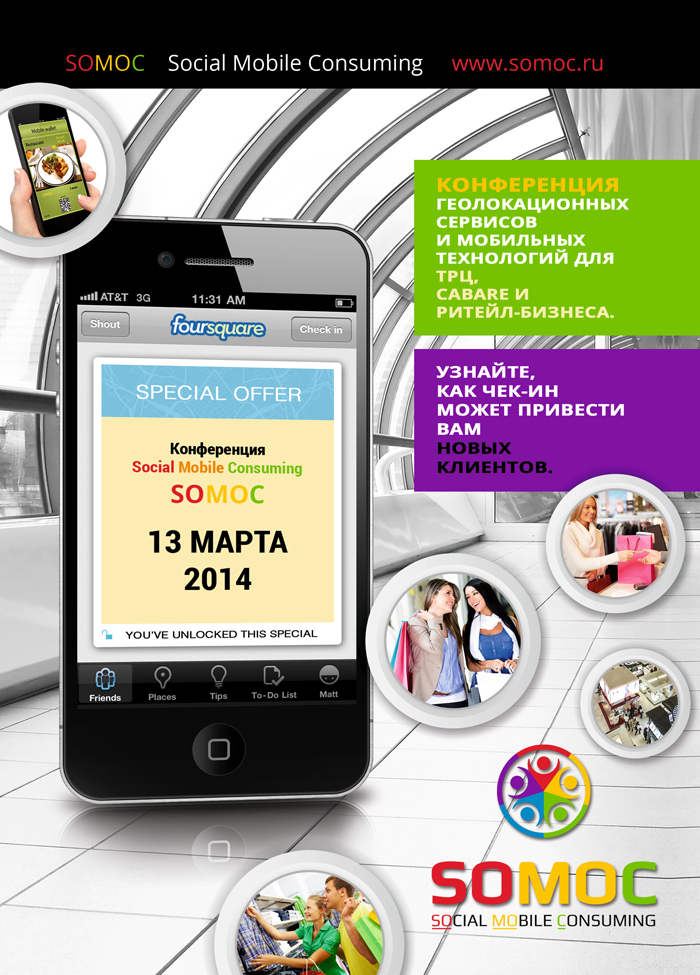 13 марта 2014 в Москве пройдет конференция нового формата - Social Mobile Consuming (SOMOC), цель которой – продемонстрировать инновации в сфере приложений с использованием геолокационных сервисов, соцсетей и мобильных технологий и показать на практике, как социальные и цифровые медиа-стратегии могут влиять на доходность оффлайн бизнеса.