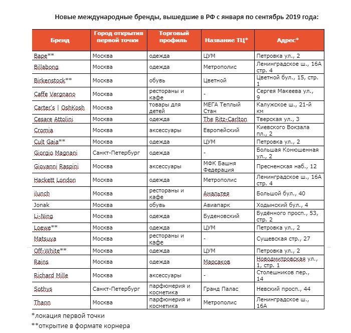 По итогам первых трех кварталов 2019 года на российский рынок вышел 21 новый международный бренд, следует из материалов исследования консалтинговой компании «Магазин Магазинов». Свои первые монобрендовые магазины в Москве открыли Billabong в «Метрополисе», одежные бренды Li-Ning, Jonak, ilunch, Hackett London, Cesare Attolini и др.