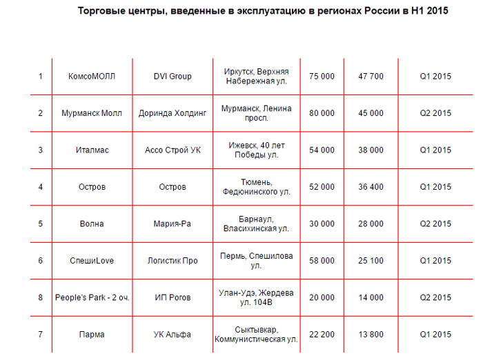 До конца 2015 года в регионах России планируются к открытию еще 30 торговых центров совокупной арендопригодной площадью 1,2 млн кв.м. В начале года к открытию в 2015 году было заявлено свыше 60 объектов суммарной GLA 2,6 млн кв.м. В первом квартале эта цифра сократилась вдвое – до 1,3 млн кв.м. В целом, на вторую половину 2015 эксперты прогнозируют открытие не более 40% от заявленного объема.