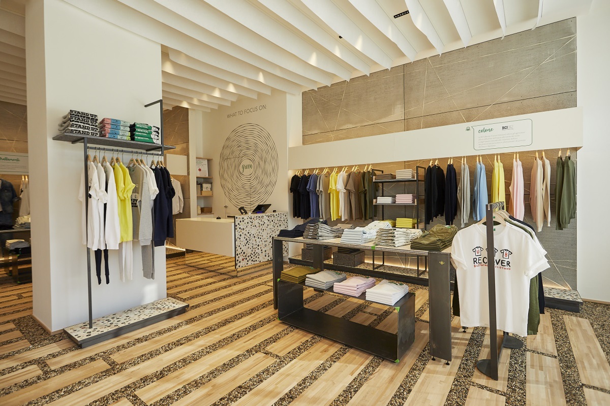 В новом магазине представлены коллекции из экологически чистой продукции United Colors of Benetton - органического или переработанного хлопка, регенерированного нейлона, натуральных волокон, таких как лен, и других экологически чистых материалов.