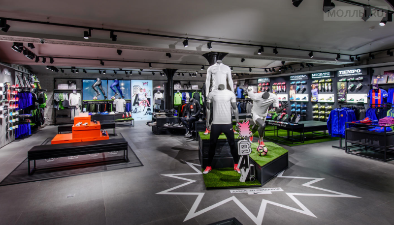 Трехуровневый магазин на Кузнецком мосту, площадью 7149 кв.м, включает концептуальные пространства Nike+ беговая зона, Nike+ футбольная зона, а также зоны персонализации на всех этажах магазина, которые созданы для индивидуализации продукции под запросы покупателей.
