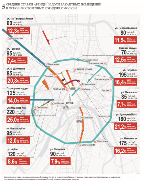 В четвертом квартале 2015 года максимальная арендная ставка на столичном рынке стрит-ритейла сохранилась на прошлогодней отметке в 250 тысяч рублей за 1 квадратный метр в год. Уровень вакантных площадей на основных торговых улицах составил 12,5%.
