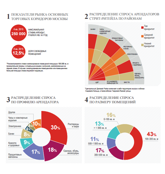 Наибольшим спросом по итогам 2015 года пользовались помещения формата от 100 до 300 кв.м. Предприятия общественного питания арендовали помещения преимущественно в «ресторанных кластерах», в то время как фэшн-ритейлеры предпочитали основные коридоры в центре Москвы.