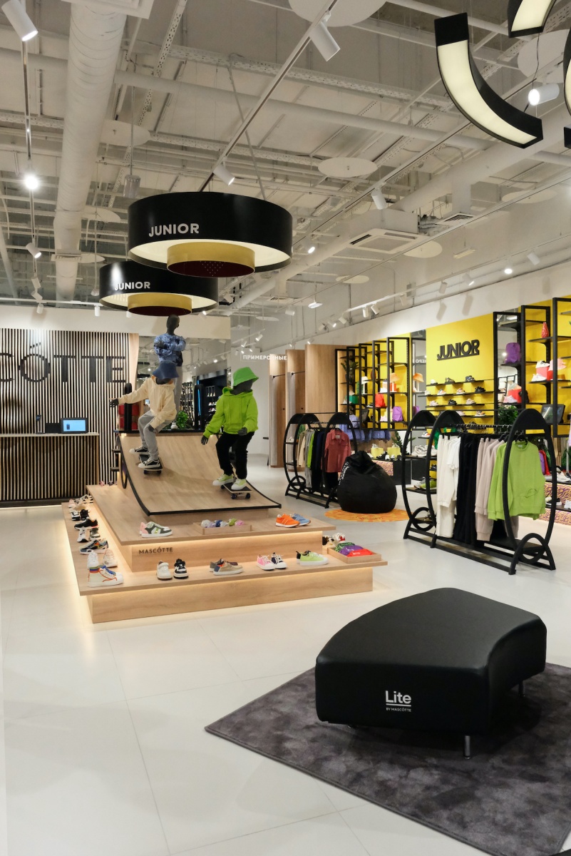 На новых площадках бренд Mascotte Junior (целевая аудитория дети 7-12 лет) располагается также отдельной зоной, привлекая внимание за счет акцентных фирменных цветов и яркого паттерна.
