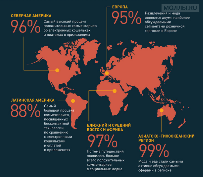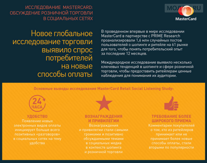 Компания MasterCard совместно с PRIME Research опубликовала результаты первого в мире исследования розничной торговли, которое было полностью построено на изучении соцмедиа. В период с июля 2014 года по июнь 2015 эксперты отследили более 1,6 миллиона постов в Twitter, Facebook, Instagram и других сетях на тему шопинга и ритейла в 61 стране мира. По результатам исследования были выявлены основные тенденции прошедшего года в мировом шопинге и ритейле.
