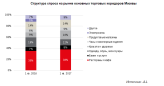 Лидерами в структура спроса на помещения в стрит-ритейле остаются кафе и рестораны, чья доля оценивается в 28%. Операторы «красоты и здоровья» занимают 16% площадей. Ротация арендаторов в основных торговых коридорах снизился до отметки в 5%. Наибольшее число арендаторов сменилось на Никольской улице и Петровке - 11% и 9% соответственно. Рост ставок аренды был отмечен на Новом Арбате (с 95 000 до 115 000 тысяч рублей за 1 кв.м в год) и на Тверской улице (со 100 000 до 115 000 рублей).