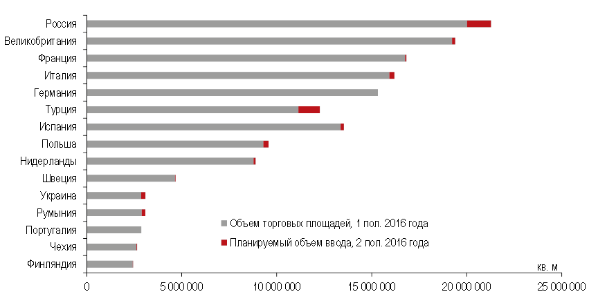 Аналитики отмечают, что несмотря на высокие объемы нового строительства рынок остается низко насыщенным качественными торговыми площадями - средний показатель по России составляет 140 тысяч кв.м на 1000 жителей, что сопоставимо с данными Турции. Для сравнения, в Нидерландах этот показатель составляет 517 тысяч кв.м, в Великобритании - 293 тысячи кв.м, во Франции - 215 тысячу кв.м.