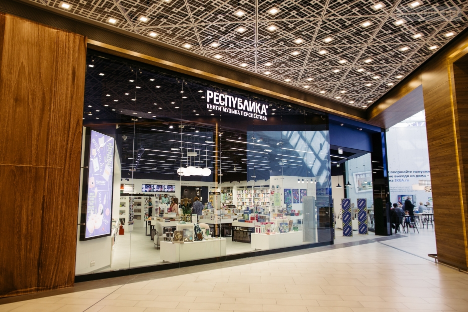 Концептуальная книжная сеть начинает экспансию в регионы с Екатеринбурга. Проект просторного и светлого пространства разработан архитекторами из бюро Rhizome group. Зигзагообразные книжные полки, подвижное оборудование, яркие цветовые акценты, сверкающая вывеска – основные элементы интерьера, которые роднят все новые РЕСПУБЛИКИ*. Зеленые растения в горшках в прикассовой зоне, неоновые элементы и островки отдыха с мягкими креслами делают место особенным и уютным.