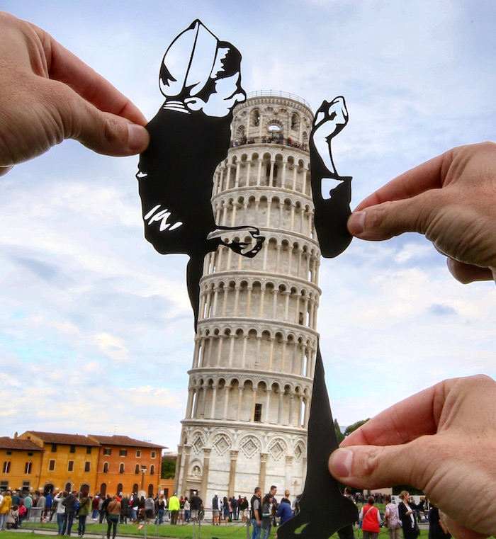 Знаменитый профиль Мэрилин Монро, моряк c Пизанской башней на руках, Триумфальная арка, которая трансформируется в человечка Lego. Есть обманчивая простота в работе фотографа. В конце концов, как художник может изменить и создать снова некоторые из самых узнаваемых видов в мире только с помощью черных вырезов бумаги?