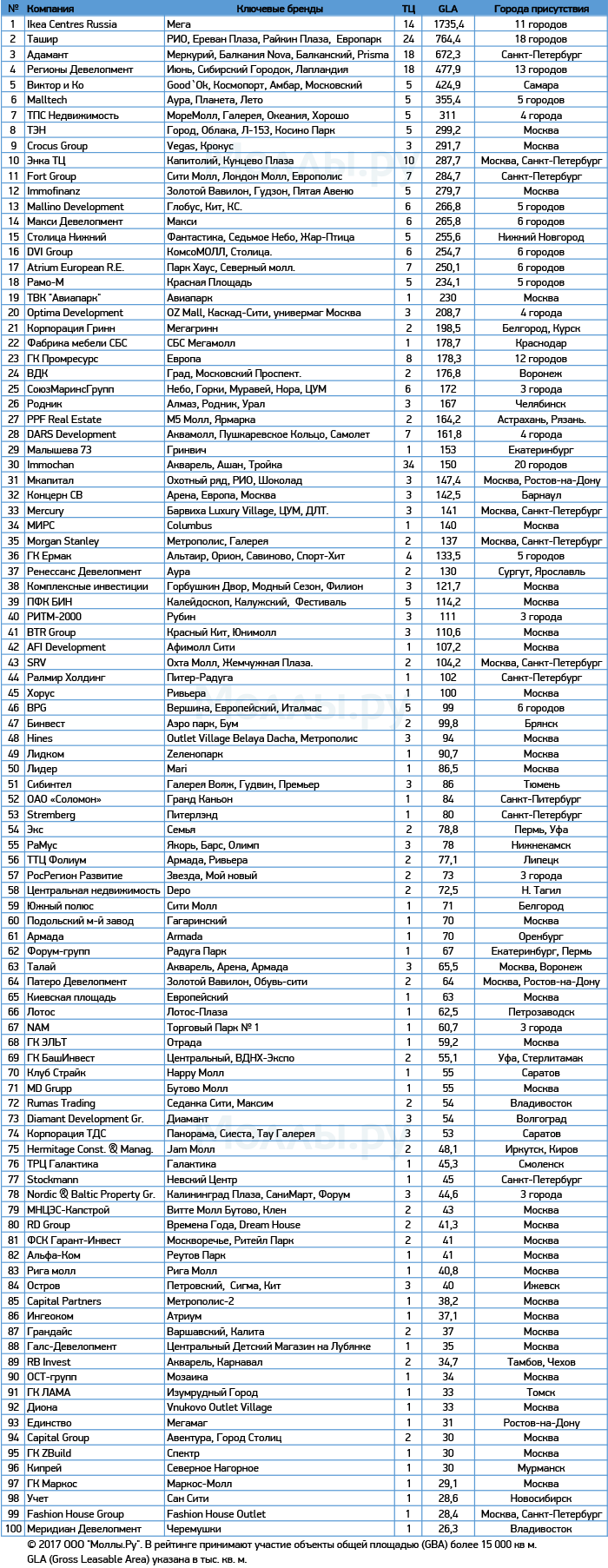 Сегодня Моллы.Ru рады представить обновленную версию собственного аналитического рейтинга «Топ-100 владельцев торговых центров России». Обзор составлен на основе актуальных данных, собранных в январе-марте 2017 года и включает полную информацию о лидирующих на рынке российских торговых центров компаниях.