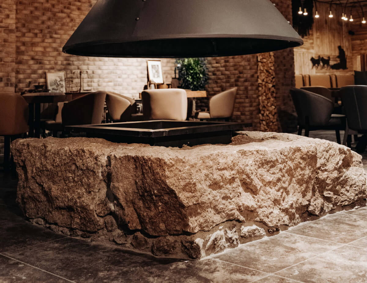 За кухню отвечает шеф-повар Дмитрий Муравьев, который знает подход к мясу диких животных, и готовит настоящие кулинарные шедевры с особенным и насыщенным мясным вкусом. Особенный интерес представляет собственная коптильня, где производят копченные деликатесы, способные удовлетворить вкус самого утонченного гурмана. Для нашего аквариума были отобраны лучшие морские моллюски и крабы с камчатки и других рыбных мест. Атмосферу ресторана дополняет удачно подобранная фоновая музыка, по вечерам в выходные дни на сцене музыкальные коллективы. К услугам маленьких гостей детская комната.