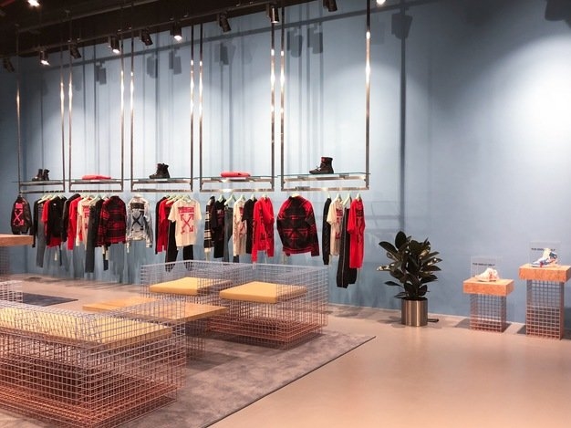 Корнер Off-White оформлен в индустриальном стиле с использованием металлической сетки, камня и изделий из латуни. В торговом пространстве представлена новая коллекция Off-White «Весна-лето 2019», посвященная любимым героям Албо - Барту Симпсону, Дональду Уайту и др. Марка также представлена в онлайн-магазине ЦУМа.