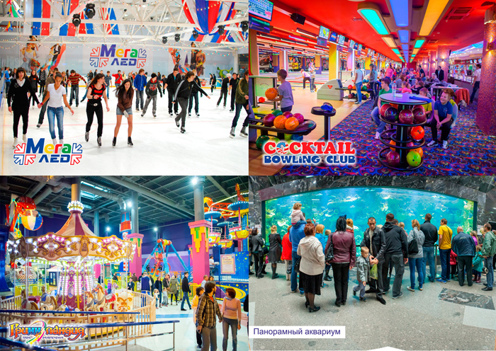 В Белгородском «МегаГРИННе» площадью 168000 кв.м впервые в России в одном здании, являющимся самым крупным в Черноземье, собрано наибольшее количество разных направлений деятельности. Его основное конкурентное преиму-щество в том, что менее половины площадей отведено под торговлю, а большая часть – под семейно-досуговые и развлекательные направления: целый этаж занимает огромный парк развлечений «ГРИННЛАНДИЯ» с многочисленными аттракционами для разных возрастов, игровыми автоматами, детским клубом без присутствия родителей, ледовым катком, фуд-кортом с семью операторами, несколькими ресторанами и кафе, а также сценой для проведения различных праздников, фонтанным комплексом. Этажом ниже расположен шестизальный кинотеатр, боулинг на 26 дорожек, бильярдный клуб на 30 столов, самый большой в городе ресторан-пивоварня на 1500 мест, а в других частях здания – молодежный клуб «ЧАСЫ», караоке-клуб «НОЧЬ» и панорамный итальянский ресторан «Мезонин». Одним из самых впечатляющих зрелищ является огромный аквариум в центральном холле водоизмещением более 100 тонн с морской водой и акулами.